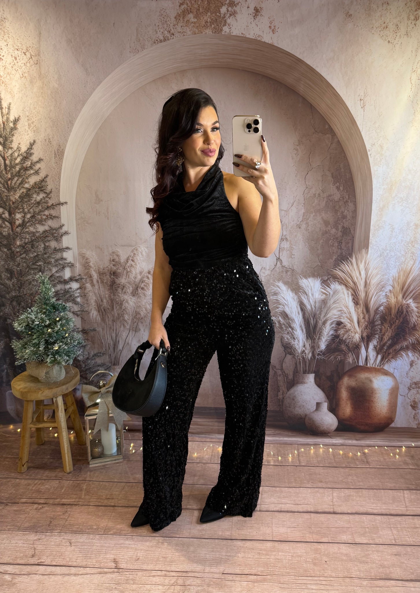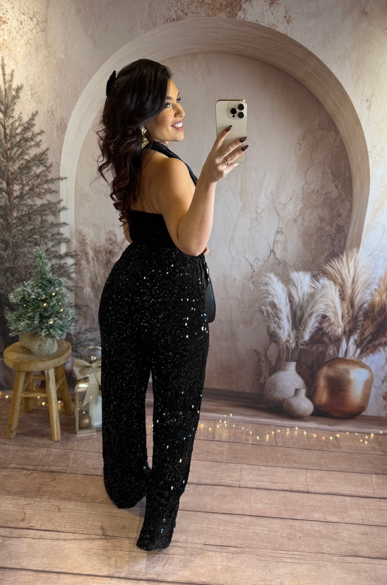 - Coupe ajustée au buste et pantalon droit orné de sequins. Fermeture au cou par