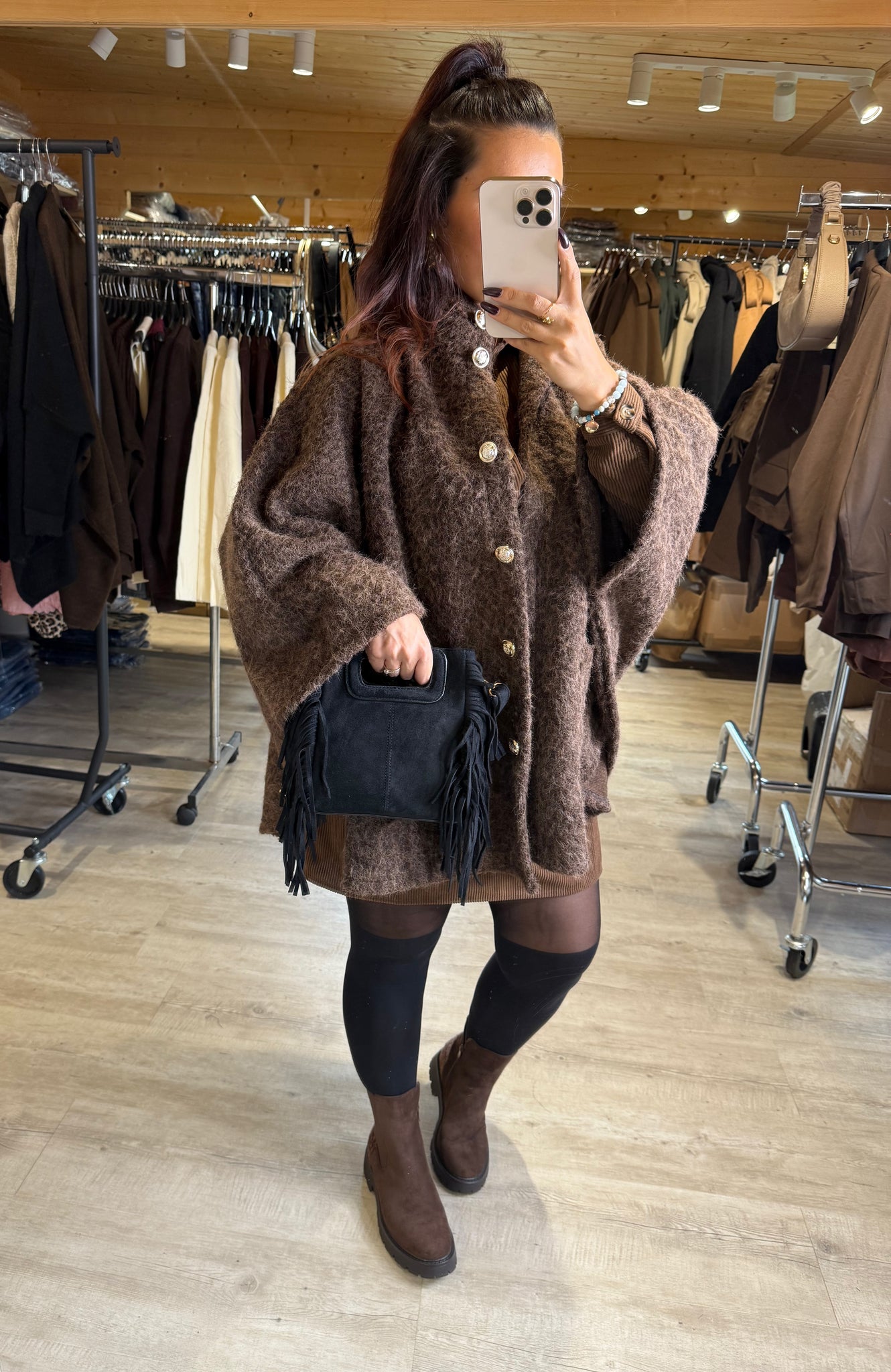 Cape col rond montant bouton à l'avant tout le long + poche visible à l'avant