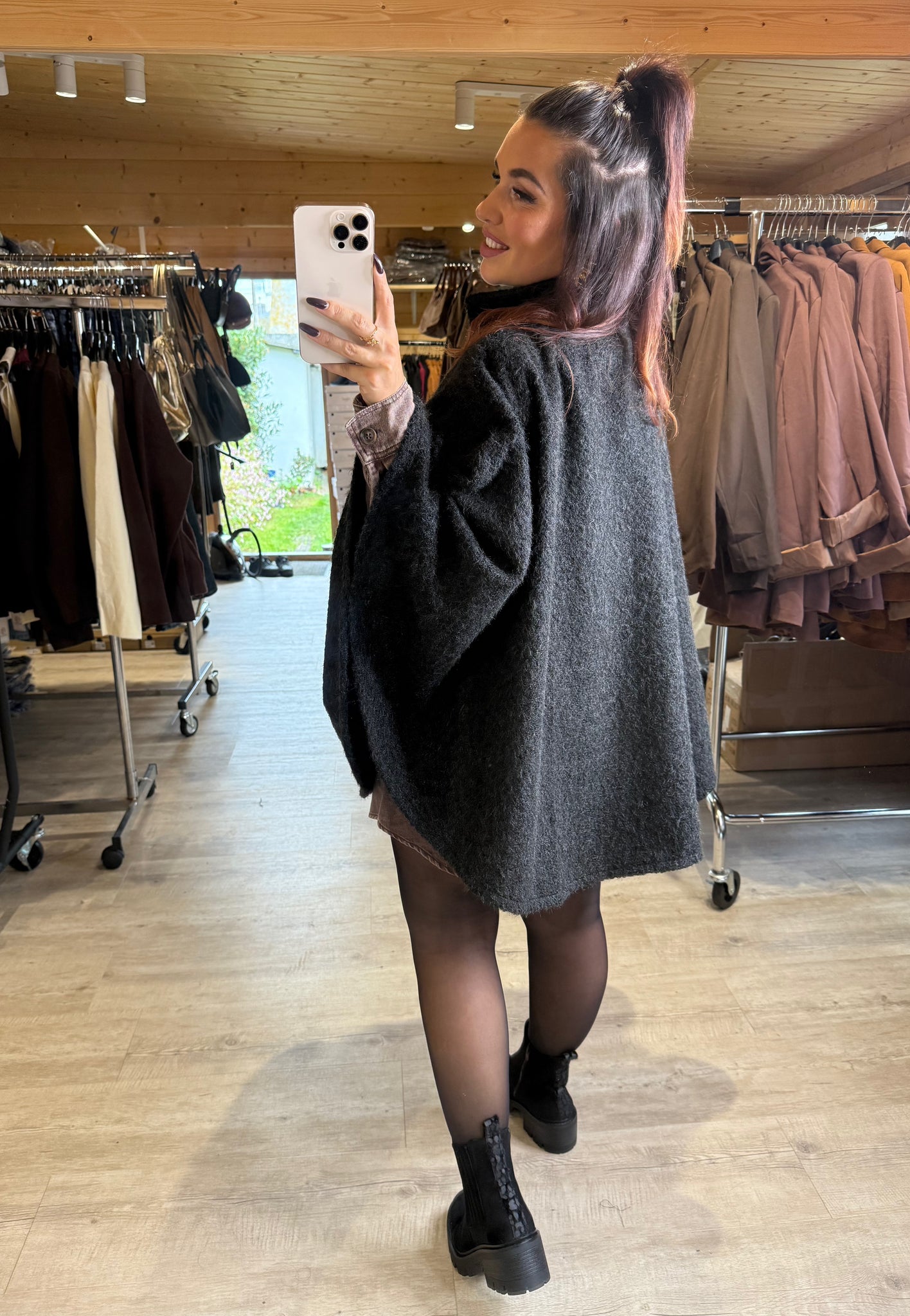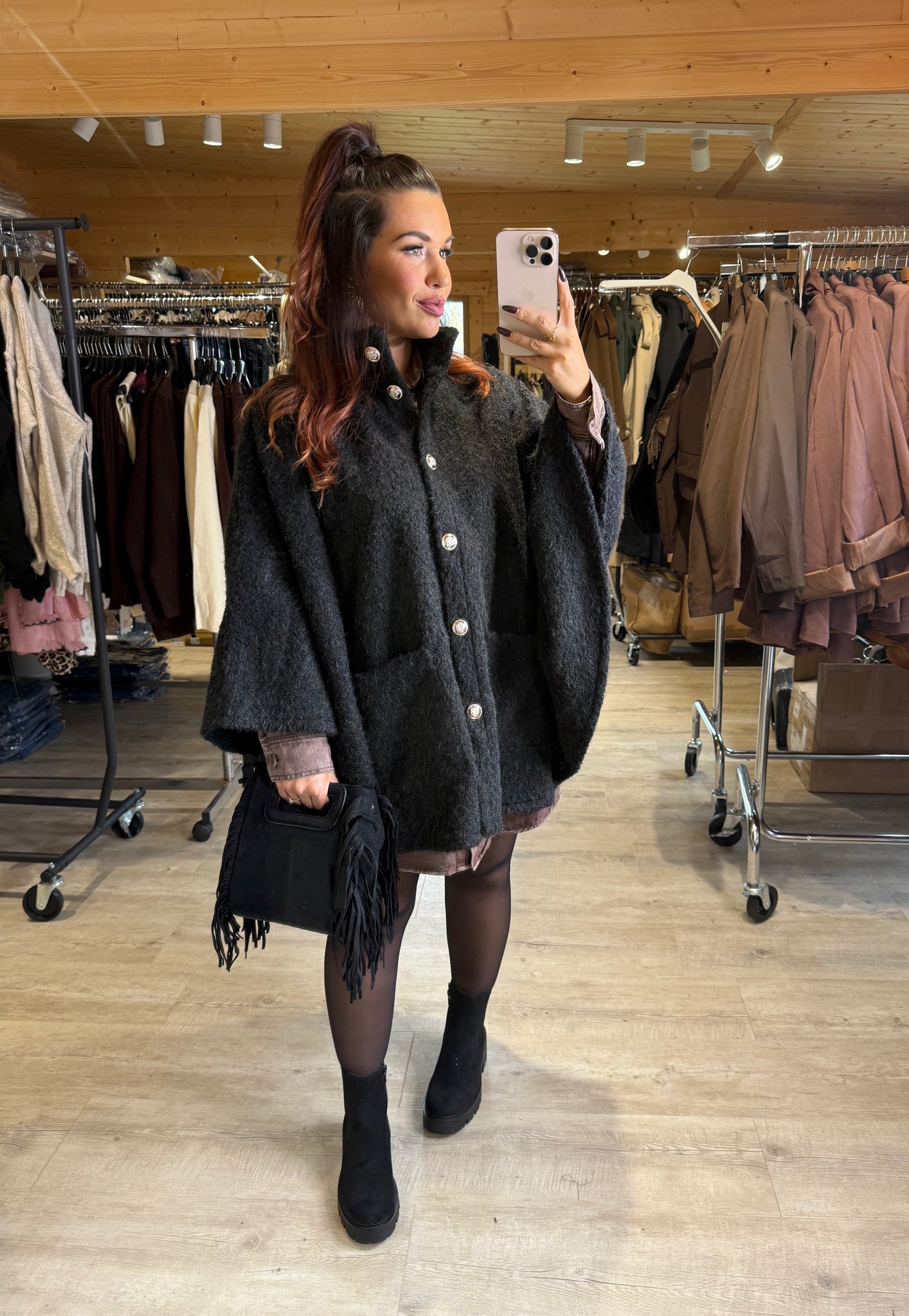 Cape col rond montant bouton à l'avant tout le long + poche visible à l'avant