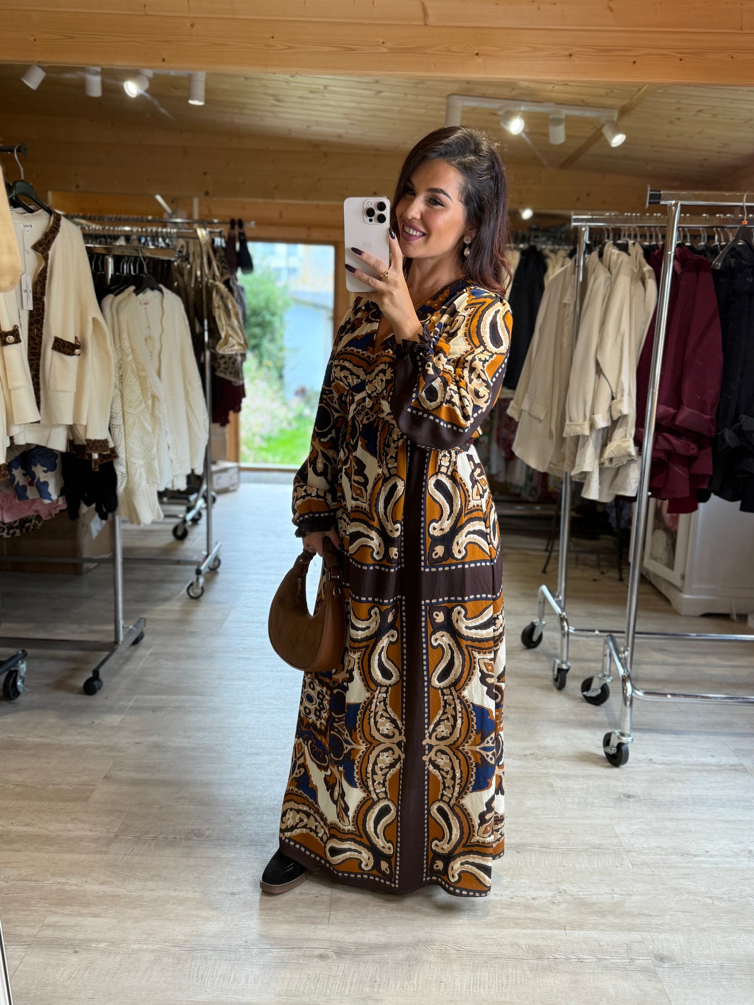 Robe longue motif bleu, camel , chocolat SANDRA (40 au 48)