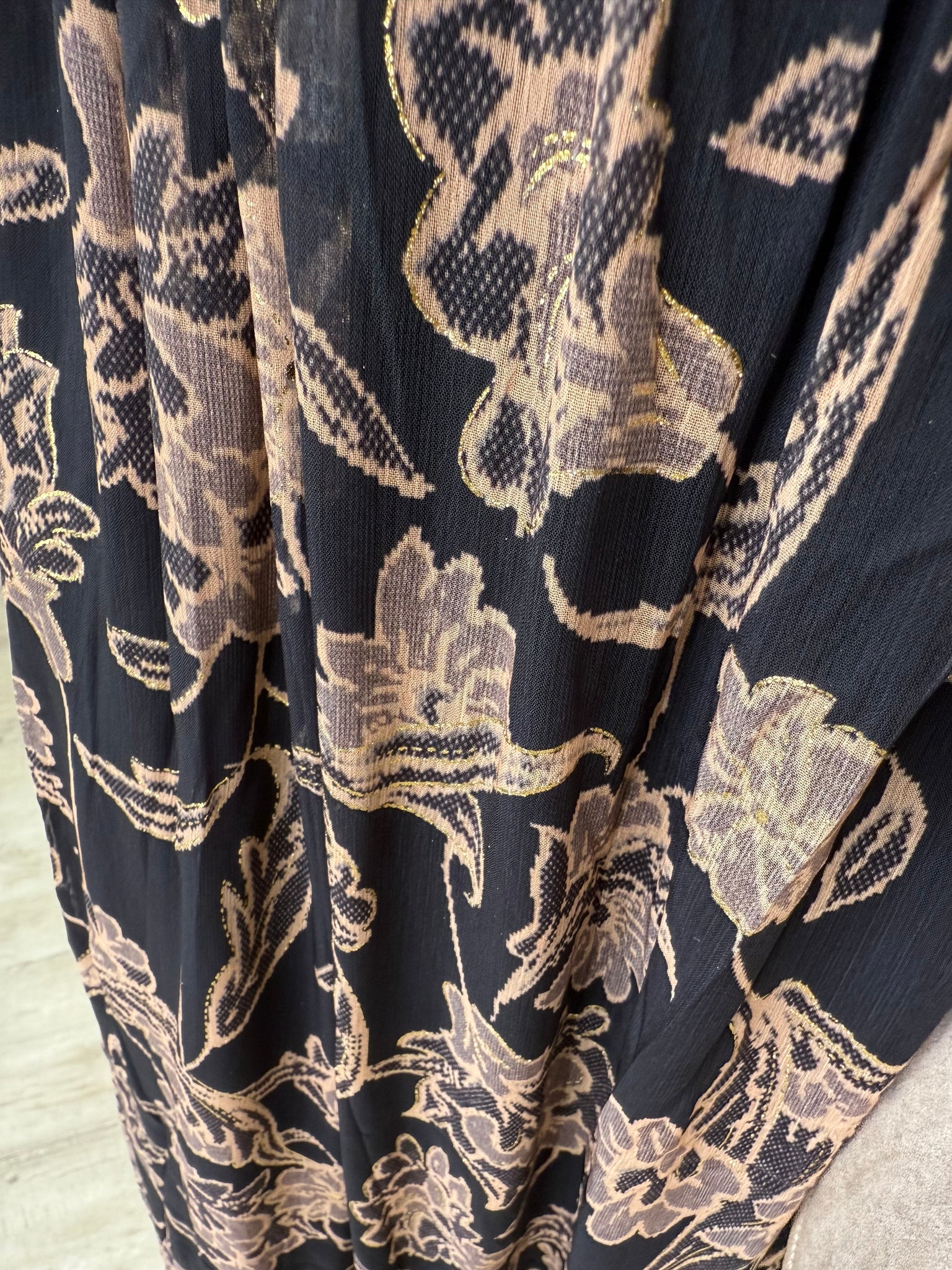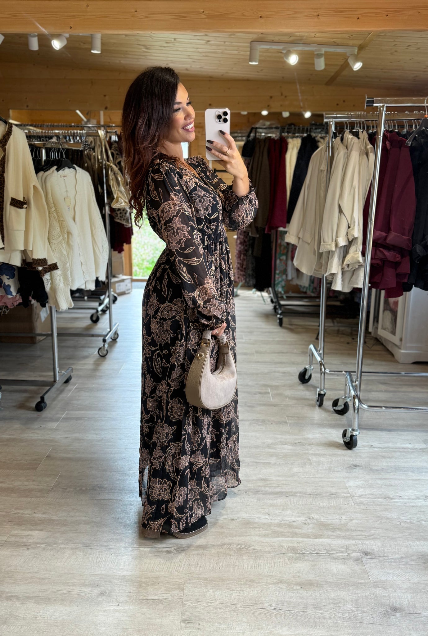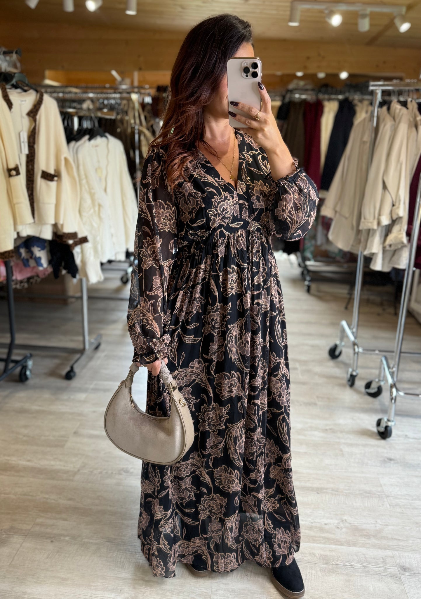 Robe longue noir motif fleur marron LINDA (40 au 48)