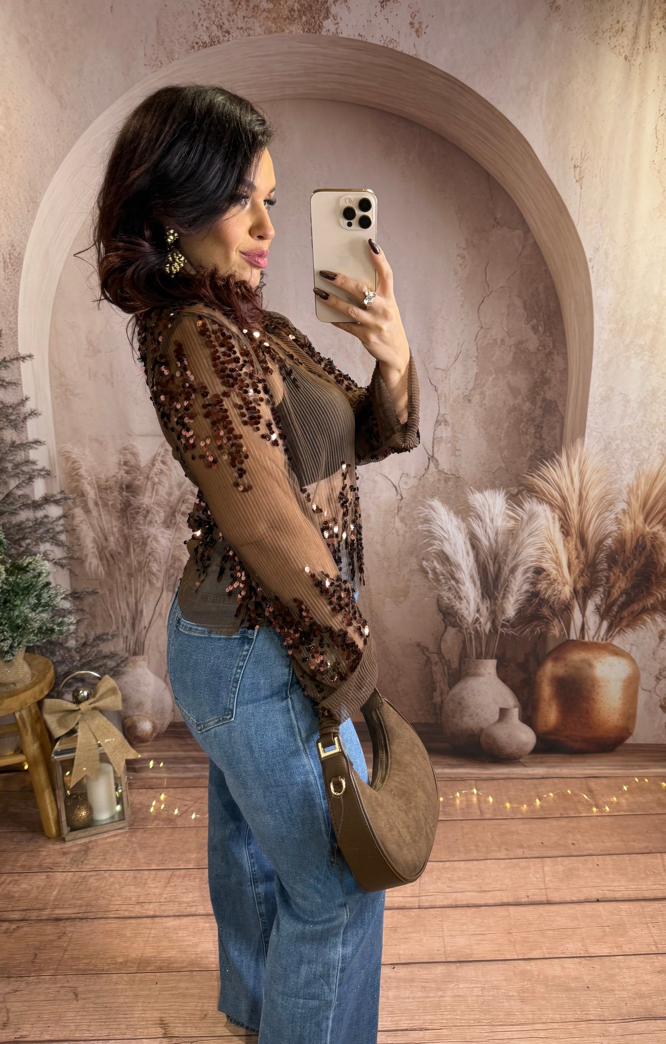 Top transparent à sequins chocolat GRACE (34 au 40)