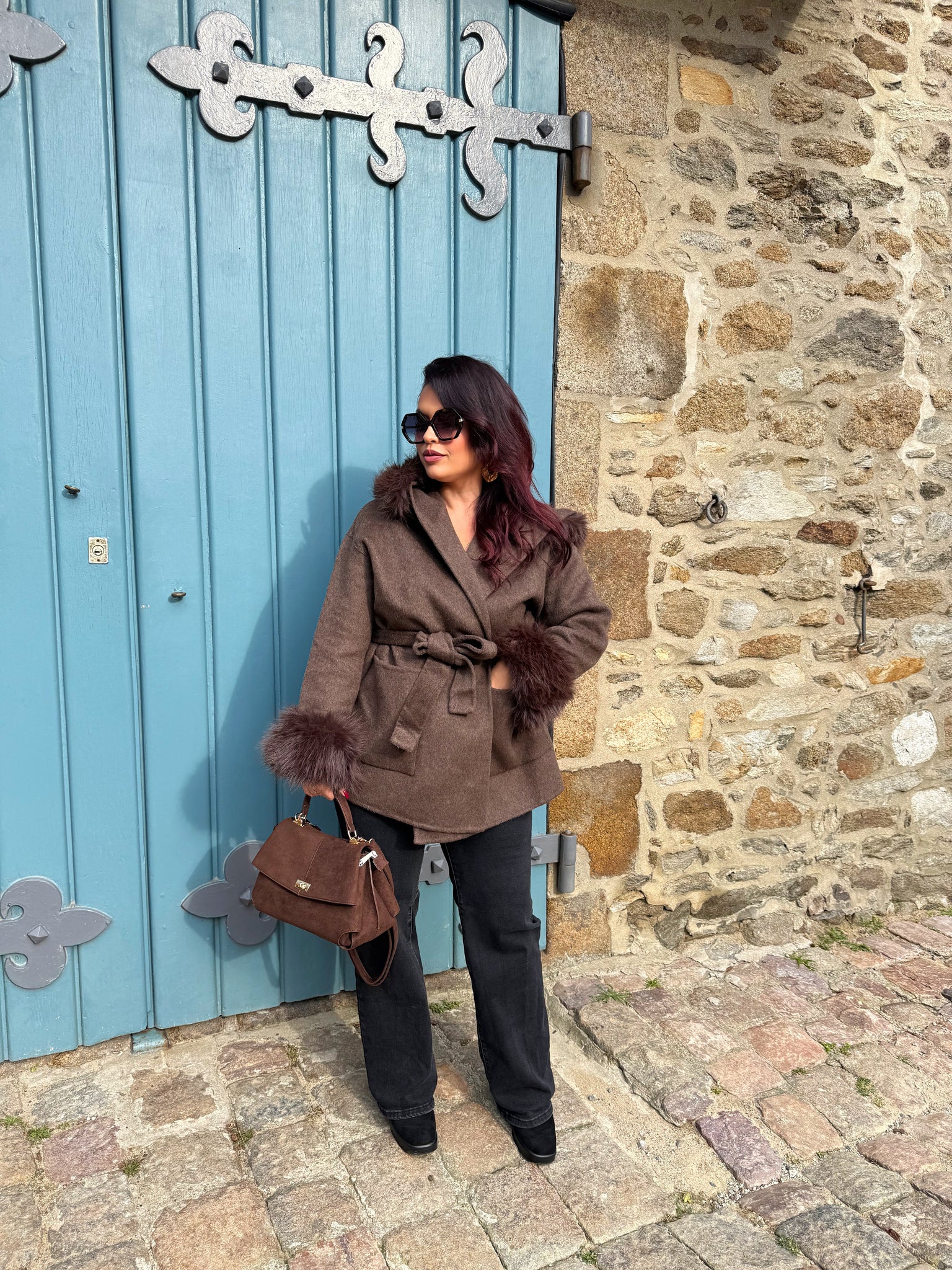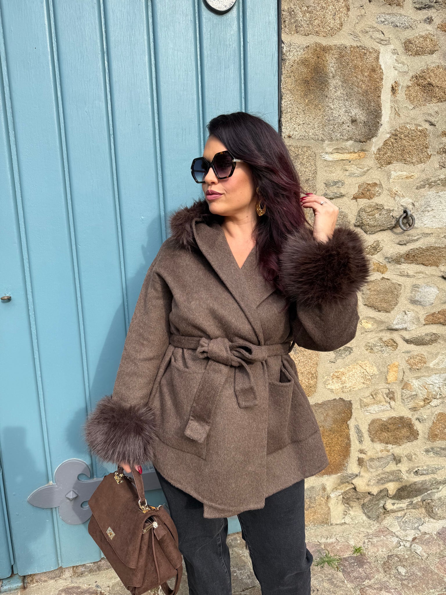 Ce manteau en laine est la pièce cocooning et élégante qu’on adore porter dès l’arrivée du froid. Son col et ses poignets en fausse fourrure apportent une touche de douceur et de sophistication à n’importe quelle tenue. Sa coupe droite ceinturée met en valeur la silhouette tout en offrant un confort absolu. On craque pour ses finitions soignées et son allure chic qui réchauffe avec style. Une pièce forte, à la fois pratique et ultra tendance.